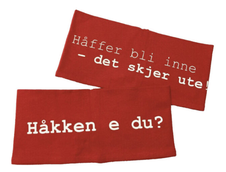Panneband «Håkken e du?» eller «Håffer bli inne – det skjer ute!». Økologisk bomull. Kr. 200,-