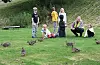 NATURFAGDAG I EVJUDALEN: Her hadde fjerde trinn ved Bø skule naturfagdag i Evjudalen. Der skulle elevane blant anna legge merke til kva som er rundt oss. Nokre hadde nesten gått seg vill i skogen nedanfor hotellet. Dei mata også endene med brød. Foto: Marta Kjøllesdal