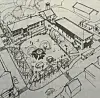25 ÅR SIDAN: Alternativet med nybygg mot Vertshuset t.h. og parkeringshus i underetasjen pluss servicekontor i nybygget rett inn frå gata og fortauet.