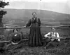 BELTESTAKK, STAKK OG LIV: Bergit Evju, født Dyrud (1869-1965), i beltestakken ho bruka så lenge ho levde. Til høgre dottera Helga Evju (1894-1947) i stakk og liv, med gitaren som truleg bror Anund har laga. Kvinna til venstre er ukjent.