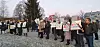 DEMONSTRASJON: Politikarane vart møtt av demonstrantar utanfor kommunehuset før møtet måndag.