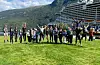 SYKLA OVER FJELLET: Ungdomstrinnet ved Sauar friskole sykla Rallarvegen frå 29. til 31. august. Her er heile gjengen framme i Flåm, der eit gigantisk crusieskip tronar i bakgrunnen. FOTO: Sauar friskoleFOTO: Sauar friskole