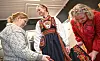 SJEKKA ALT NØYE: Bunadsmodell Nina Bjerkeli med Aust-Telemarksbunad og dei to bunadskontrollørane Anny Lømo Strand (t.v.) og Hanne Beate Thomsen.