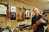 FELEMAKAR: Ottar Kåsa med den siste fela han har laga. Den skal Torgeir Straand ha. Bak heng feler laga av mellom andre Eilev Johnsen Steintjønndalen, Hans Johnsen & Søn og Eivind Ralle.