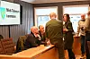 AVGJORT: Administrerande direktør Alexander Grønlien (t.v.) i Konsept pluss AS og Kjell Roar Kaasa frå Allstad i samtale med kommunedirektør Per Dehli og ordførar Siri Blichfeldt Dyrland etter vedtaket.