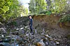 VEGEN ER BORTE: Leiar i Bø turlag, Arne W. Hjeltnes, står i eit krater der vegen er heilt vaska vekk. Dette er ein turveg som har høg prioritet for turlaget.