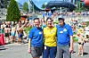 SOL OG SMIL: Personalansvarleg Ingrid Norheim, områdeleiar for spelavdelinga, Susanne Strandberg, og parkdirektør René Langeveld Sas midt i vassparken med eit vrimmel av gjester rundt i heile parken. FOTO: Øystein Akselberg