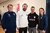 SAMARBEID: Fotballklubbar i Midt-Telemark skal samarbeide med Odds ballklubb. F.v. Stian Jensen frå Skarphedin fotball, Einar Håndlykken frå Odds ballklubb, Tobias Hansen frå Sauherad fotball og Trine Aaltvedt-Rønning.