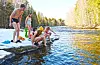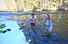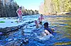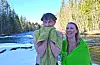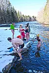 Sofie og Niels var dei to første til å ta eit elvebad på Vaskeberget i Bøelva søndag ettermiddag. I bad nummer to fekk dei med seg kommunens ordførar.