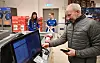 HJELP TIL PAKKING: Ove Hellekås på fredagshandel på Rema 1000 Skogen. Bak står skarphedinjentene Jenny Strand og Kristin Tangen og hjelper til med å pakke varene til kundane.
