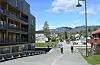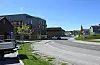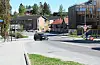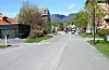 TRAFIKK: Lektorvegen går inn til venstre. Like ved er Extra og Kiwi. Bak fotografen helsestasjon og sjukeheim. Nokre elevar går av busen ved helsestasjonen. FOTO: Marta Kjøllesdal