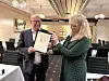 HØGTHENGANDE: Sveinung Leikvoll fekk høgthengande heider overrekt av fylkesleiar Anne-Nora Oma Dale.