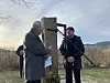 75 ÅR SEINARE: Bjørn Holta i Sauherad historielag saman med Arnt Darrud som har laga minnesmerket.