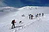 Utfartsdag. Utsikt mot Glekserenna der nokre skiløpaar har svinga seg fint ned.
