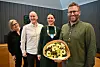 HEIDRA: Lars Jørum fekk blomstrar og gode ord av Hilde Pedersen (bak f.v.), Glenn Isaksen og Siri Blichfeldt Dyrland.