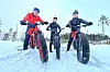 SYKLAR HEILE ÅRET: Rune Kyvik (f.v.), Arne Kildahl og Ole Johnny Prestbakken på kvar sin fatbike, som er ein lett terrengsykkel med skikkeleg feite dekk. Her er dei på ein av stiane som er tråkka opp med tråkkemaskina Snowdog.
